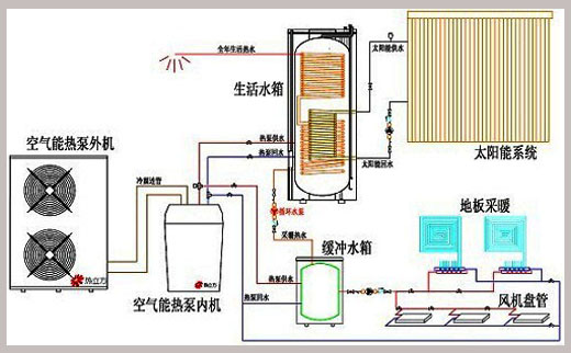 系統(tǒng)采用空氣能熱泵輔助太陽能,或電輔助太陽能,或單獨空氣能熱泵帶動,結合地暖、風機盤管(立式或者吊頂)實現(xiàn)冬季采暖;