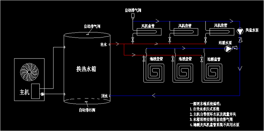 二、【一源兩末端】空氣能熱泵采暖制冷系統(tǒng)原理圖